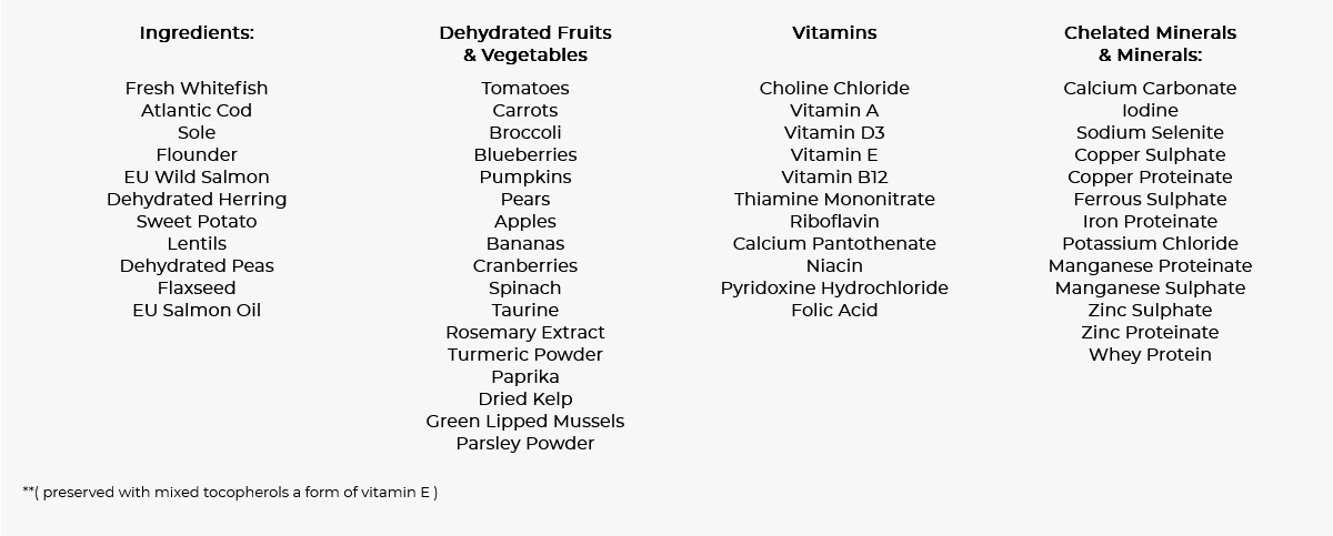 新鮮白魚 (大西洋鱈魚、鰈目魚、比目魚、歐盟野生三文魚)、脫水鯡魚、甘薯、扁豆、脫水豌豆、亞麻籽、歐盟三文魚油、脫水水果和蔬菜:蕃茄、胡蘿蔔、西蘭花、藍莓、南瓜、梨、蘋果、香蕉、蔓越莓、菠菜、牛磺酸、迷迭香提取物、薑黃粉、紅椒粉、乾海帶、綠唇貽貝、歐芹粉、乳清蛋白。維生素、螫合礦物質和礦物質:膽鹼氯化物、維生素A、維生素D3、維生素E、維生素B12、硫胺素單硝酸鹽、核黃素、泛酸鈣、煙酸、鹽酸吡哆醇、葉酸、碳酸鈣、碘酸鈣、亞硒酸鈉、硫酸銅、蛋白銅、硫酸亞鐵、蛋白鐵、氯化鉀、蛋白錳、硫酸錳、硫酸鋅、蛋白鋅。