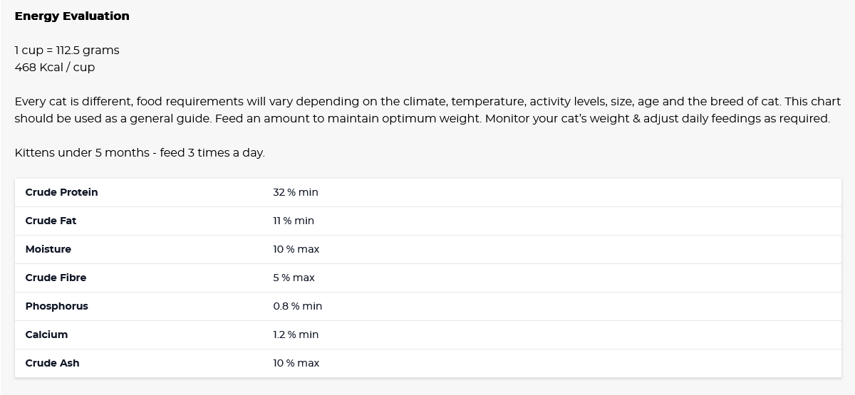 新鮮白魚和脫水三文魚為第一、第二成分。肉類是主要的蛋白質來源,佔 38%。